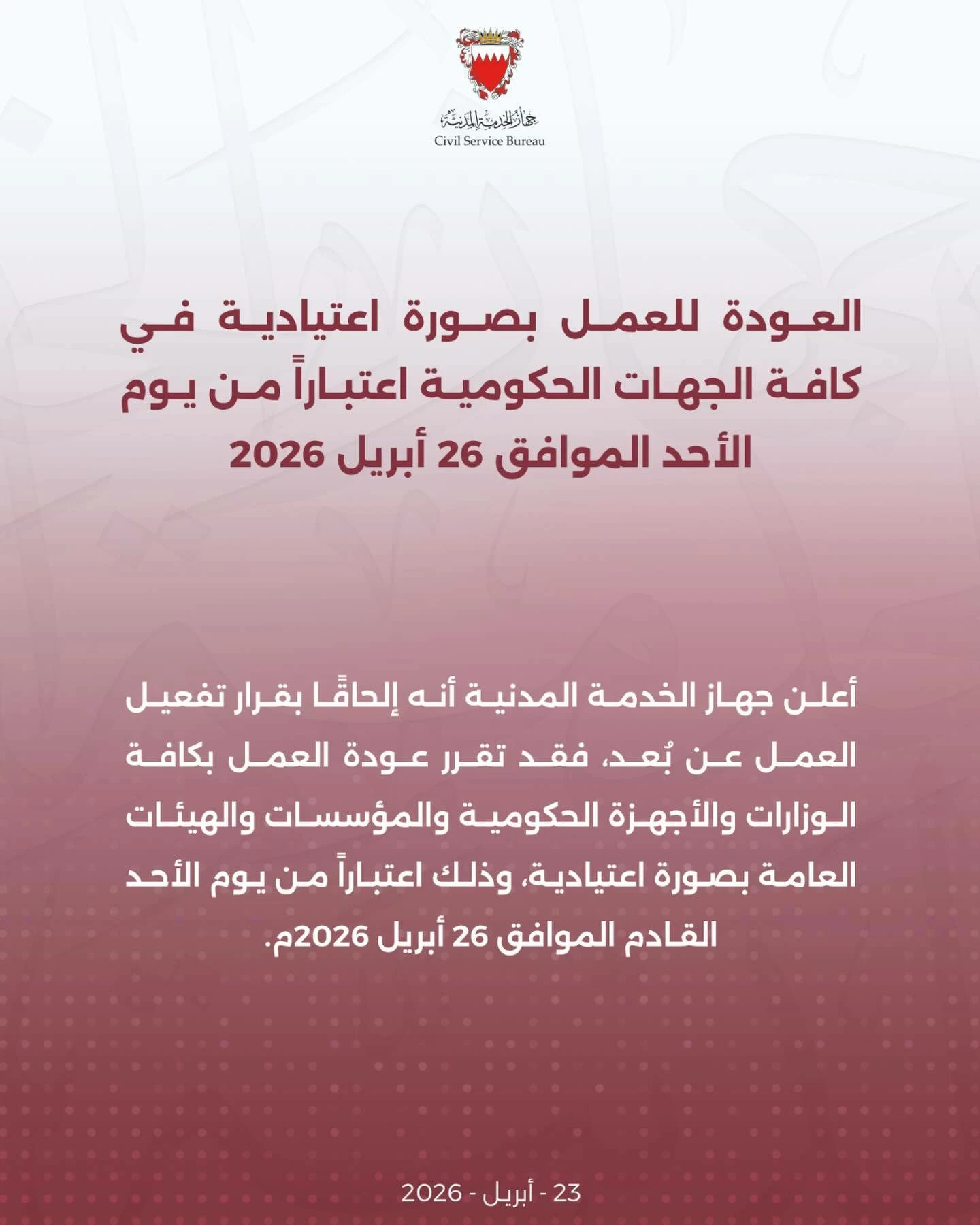 أعلنت ديوان الخدمة المدنية أنه إلحاقاً لقرار تفعيل العمل عن بعد، فقد تقرر عودة العمل في جميع الوزارات والهيئات الحكومية والمؤسسات والهيئات العامة كالمعتاد، وذلك اعتباراً من يوم الأحد المقبل الموافق 26 إبريل 2026م.