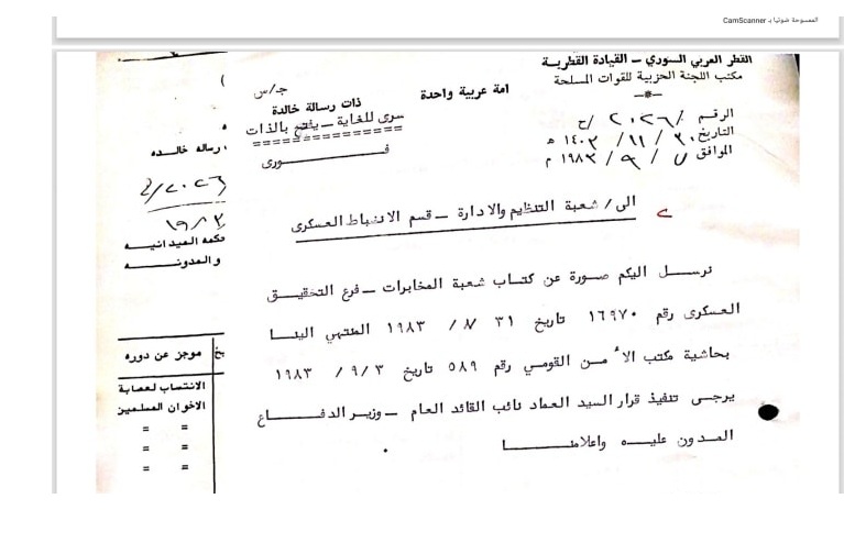 كشفت مجموعة صور من وثائق عسكرية من أرشيف “شعبة التنظيم والإدارة” و”شعبة المخابرات العسكرية” في نظام الأسد السابق، عن آلية عمل “المحاكم العسكرية الميدانية” التي نشطت مطلع الثمانينيات. وتتناول الوثائق، التي يعود تاريخها إلى سبتمبر/أيلول 1983، تفاصيل قرارات إحالة العشرات من العسكريين والمدنيين إلى المحاكمة بتهمة “الانتماء إلى عصابة الإخوان المسلمين”. وتظهر الوثائق التسلسل القيادي الصارم في اتخاذ القرارات القمعية في ذلك الوقت. بدأت المكاتبات من فرع التحقيق العسكري (التابع لشعبة المخابرات) برقم (16970) بتاريخ 21 آب 1983. ورفعت هذه القوائم إلى مكتب الأمن الوطني والقيادة القطرية لحزب البعث، لتنتهي بقرار صادر عن نائب القائد العام للجيش والقوات المسلحة وزير الدفاع (آنذاك العميد مصطفى طلاس) الذي وقع على قرار الإحالة إلى المحكمة الميدانية. المحاكم الميدانية: عدالة غيابية وقرارات غير منشورة نصت المادة 2 من القرار رقم (1126) على “عدم نشر القرار”، في إشارة واضحة إلى السرية المطلقة التي تحيط بهذه المحاكمات. وبحسب الوثيقة، فقد تمت إحالة هؤلاء الأشخاص إلى المحاكمة بناء على “ملخص دورهم”، الذي اقتصر في معظم الأحيان على تهمة الانتماء إلى “عصابة الإخوان المسلمين”. وتضم القوائم (56) اسماً موزعة على العسكريين. ومدنيون: عسكريون: ضمت القائمة (14) عسكرياً برتب تتراوح بين “رقيب” إلى “مجند”، ينتمون إلى وحدات مختلفة مثل “الفرقة الخامسة” و”كلية المدرعات” و”مدرسة القيادة”. وتضمنت القائمة (42) مدنياً. أما عن التوزيع الجغرافي فيلاحظ أن انتماء المعتقلين إلى مدينة حماة يتركز بشكل ملحوظ، بالإضافة إلى أسماء من دمشق واللاذقية وإدلب وحمص. كما تشير الوثائق إلى اعتقال أشخاص بتهمة «تنفيذ عمليات تهريب» عبر الحدود. وتأتي هذه الوثائق (سبتمبر 1983) في أعقاب الأحداث الدامية التي شهدتها مدينة حماة (فبراير 1982)، والتي تعكس استمرار الملاحقات الأمنية والتصفية القانونية والجسدية لسنوات بعد انتهاء العمليات العسكرية الكبرى. وعرفت «المحاكم الميدانية العسكرية» بافتقارها إلى الحد الأدنى من معايير المحاكمة العادلة، إذ لم يكن مسموحًا للمتهمين بالاستعانة بمحامين، وكثيرًا ما صدرت أحكام بالإعدام أو السجن المؤبد دون محاكمة. وأبرز الأسماء في القوائم: “حسن بن خالد رمضان” رقيب (فرقة خامسة) حماة (1957)، “محمد نذير بن إسماعيل الطحان” رقيب (شعبة المخابرات) التل (1960)، “عبد الله بن عبد العزيز اليوسف – مدني حماة (1940)، و”أحمد إسماعيل بكداش، مدني اللاذقية (1935). هو أن هذه الوثائق دليل واضح على نهج “الدولة الأمنية” في سوريا خلال الثمانينيات، حيث كانت القرارات مصيرية والحياة تقرر في مكاتب ضيقة وتنفذ من خلال محاكم استثنائية، بعيدة عن الرقابة القضائية أو الشعبية.